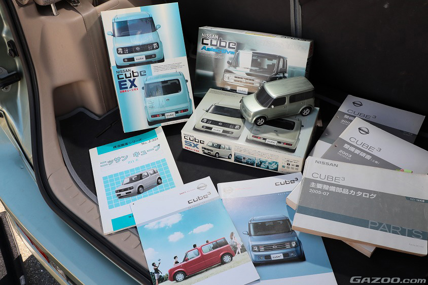 かつてはスポーツカーのミニカーばかり買っていたが、今ではキューブのミニカーやプラモデルを見かけると、ついつい買ってしまうというなやさん。そうして、カタログや整備書、当時の純正アクセサリーなども買い集めるようになったそうだ。助手席の前に備わる木目パネルや、シートにかけてあるシートエプロンなどもネットオークションで購入し、DIYでの取り付けを楽しんだアイテムたちである。