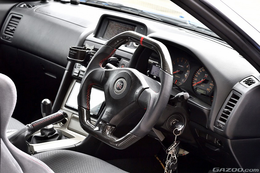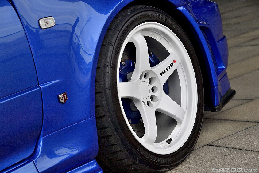 フロントフェンダーはニスモ・Zチューンスタイルに変更、サスペンションもニスモ製をチョイス。走りの基礎となる部分はニスモ製で纏めることで、GT-Rらしさを損なうことなく、ノーマルからのバージョンアップを図っているのだ。