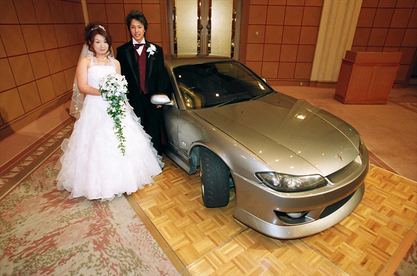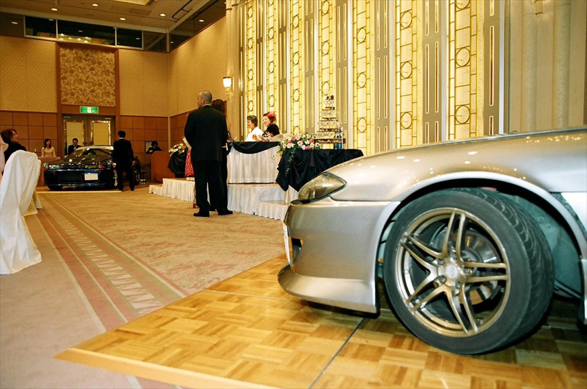 結婚式会場にはふたりのそれぞれの愛車を展示