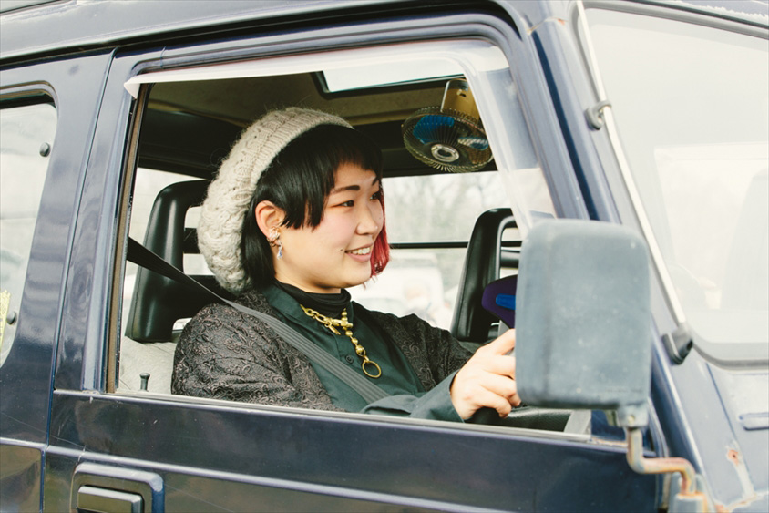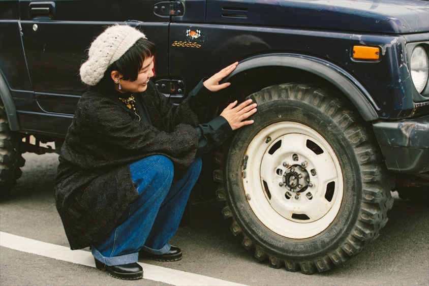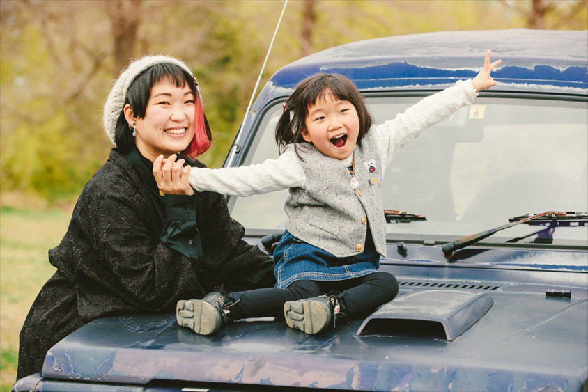 存在感たっぷりの愛車ジムニーに愛娘のけいちゃんを乗せ、颯爽と現れた猪瀬さん。赤いメッシュヘアにジャケット代わりに着たレースの羽織が、個性的な猪瀬さんにとてもよく似合います。