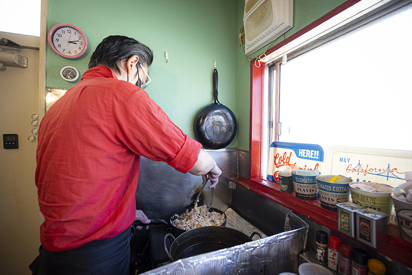 キッチンカーで調理する際、大橋さんは小型の折り畳み椅子に座って作業をします。軽自動車なのでとても狭そうです。でも軽自動車だからこその利点もあります。住宅街の細い道を苦もなく移動し、ちょっとしたスペースがあれば出店できます。