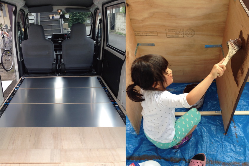 まずはフロアに板を張って床を作り、荷室の後方に給排水用のタンクと発電機を設置。その上にさらに板を張って棚を作り、調理用スペースと流しを設けました。