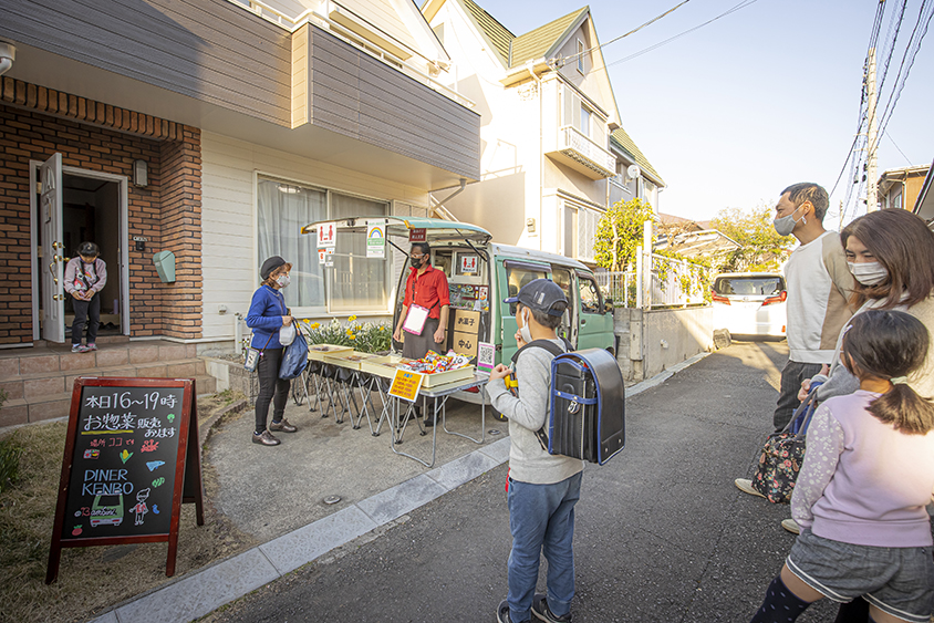 住宅街でお総菜を販売する大橋さんのキッチンカー。そのまわりに集まっている子供、親御さん、お年寄りは、お客さん? それともただ談笑している通りがかりのひと? ぱっと見では区別がつきません。