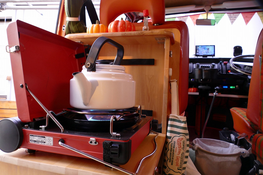 購入後にシンクやコンロの位置を変え、内装全般に手が加えられています。折り畳み式の小さな収納ラックを開くとカセット式のコンロがちょうどよく収まるなど、使い勝手よくアレンジされています。