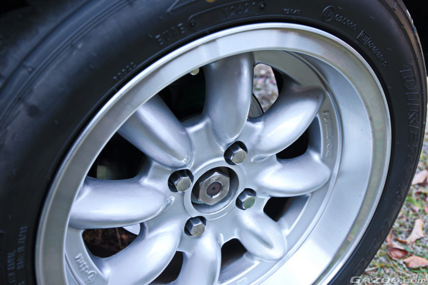 軽快な走りを生み出す足まわりにも、しっかりと手が入れられている。サスペンションはSPAX製の車高調整式に変更。タイヤ&ホイールはフロント13インチ、リヤ14インチという異径設定で、タイヤの選択肢が非常に少なく、維持していく上で少々苦労するそうだが、望みのセットが決まれば、その走りは軽快そのものだ。
