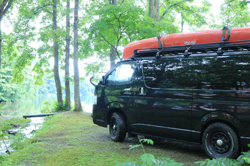 ハイエースと同じ長さの赤いカナディアンカヌーを、ルーフに乗せているところですかね。黒いボディーに赤いカヌーを乗せるというスタイルが、なんか良いなと思っています。