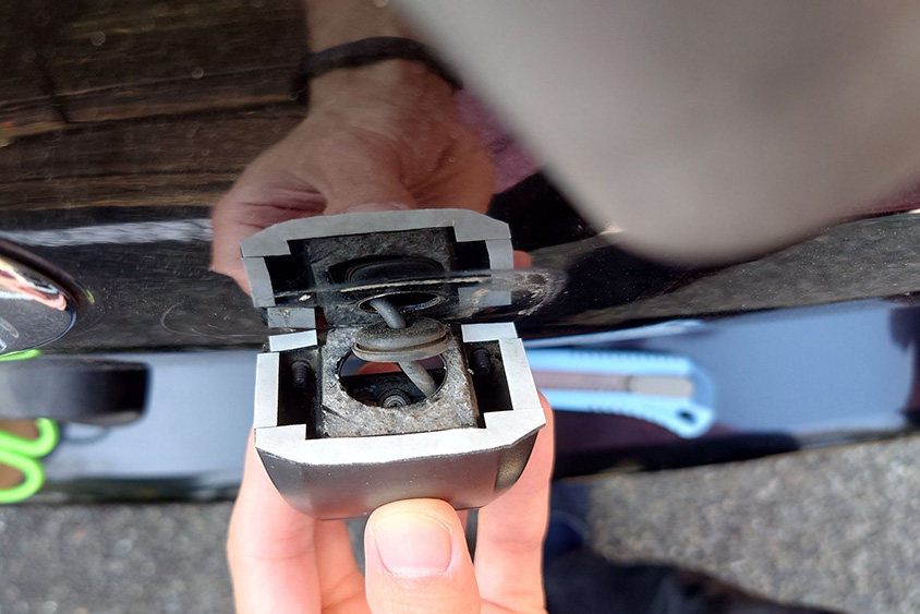 あとは、後ろのバックモニターカメラの修理です。みんな、ここを引き上げてバックドアを開けるから取れちゃいまして(笑)。マイナスドライバーを使って古いテープを剥がし、強力両面テープを貼って装着しました。こういう風に、ちょこちょこ手を加えながら乗るというのも、楽しいポイントです。