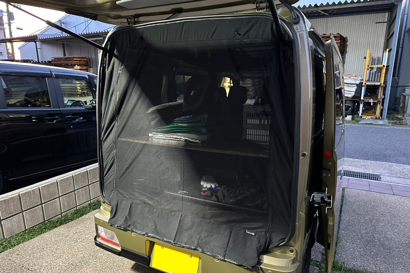 流石に全開は防犯上怖いので、半開き出来るようなステーと蚊帳を取り付けています。実際に車中泊をしてみて分かったんですけど、アトレーってエンジンからの熱がこもりやすく、風が抜けないと朝方まで車内がずっと暑いままなんですよ。だから、ほかにも後部座席のスライドドアのポップアップガラスにパソコン用のファンを取り付けるなどしています。