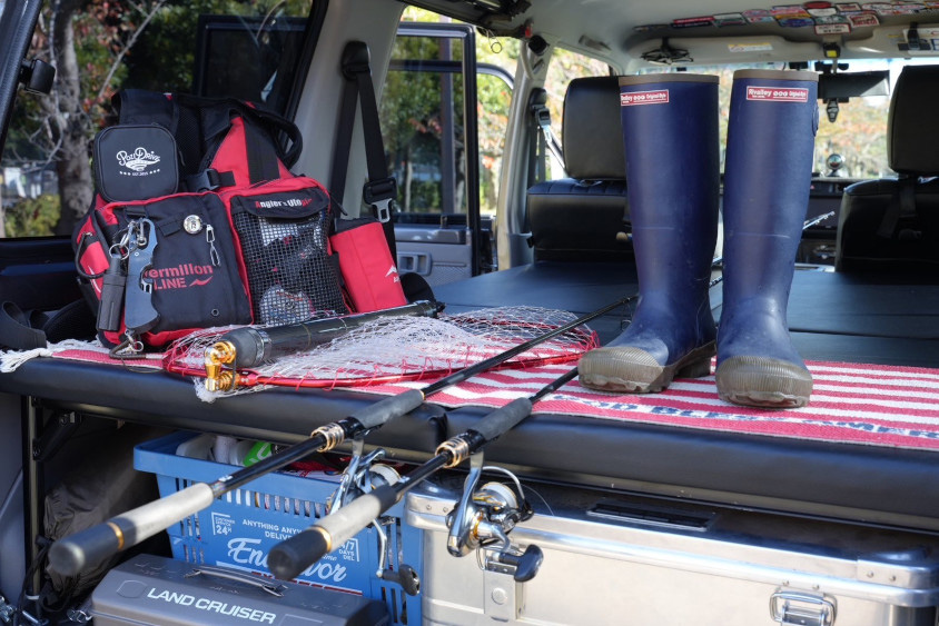 ほかには、趣味が釣りなので、車内に釣竿。ベッドキット、キャンプ道具をセットして、フラッと遊びに行くこともしょっちゅうです。
