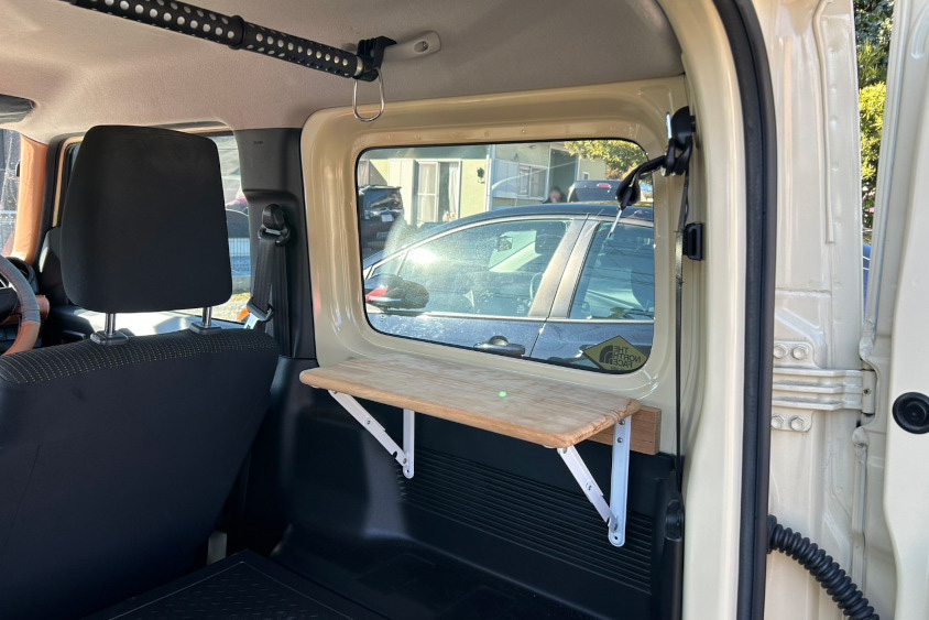 7kmで購入しましたが、週末だけしか乗っていないのにアチコチ出かけていたら4万kmほどになりました。後ろに折り畳めるテーブルをつけて、リアドアを開けて景色を見ながら車内で軽食を食べられるようにしたり、フラットにして寝転べるようにヘッドレストをしまえる収納をつくったりなど、YouTubeを見ながら自分達でDIYをしていたら、もっと居心地が良くなってお出掛けしちゃうんですよね……(笑)。