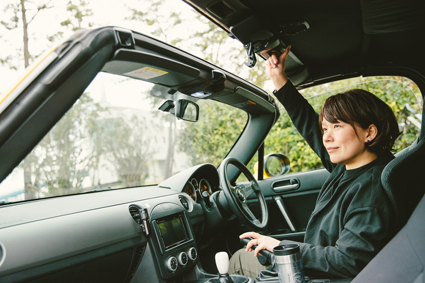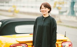 鮮やかな黄色のロードスターでさっそうと現れたフリーランスデザイナーの武藤絵美さん。シンプルなコーディネートのファッションに、鮮やかな黄色いロードスターの相性がとてもおしゃれ。そんな絵美さんの日常には、いつもロードスターが一緒でフットワークはとても軽い。たとえばふっと思い立ったときにパソコンと、クルマの鍵を手に取り、愛車のロードスターに乗り込み家をあとにする。前から気になっていたカフェへ行くときもあれば、偶然その日に見つけたカフェへ入ることもある。