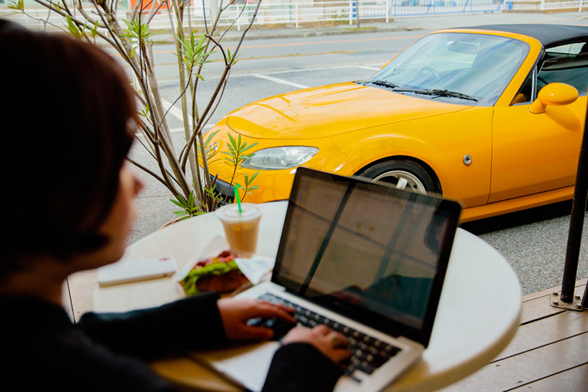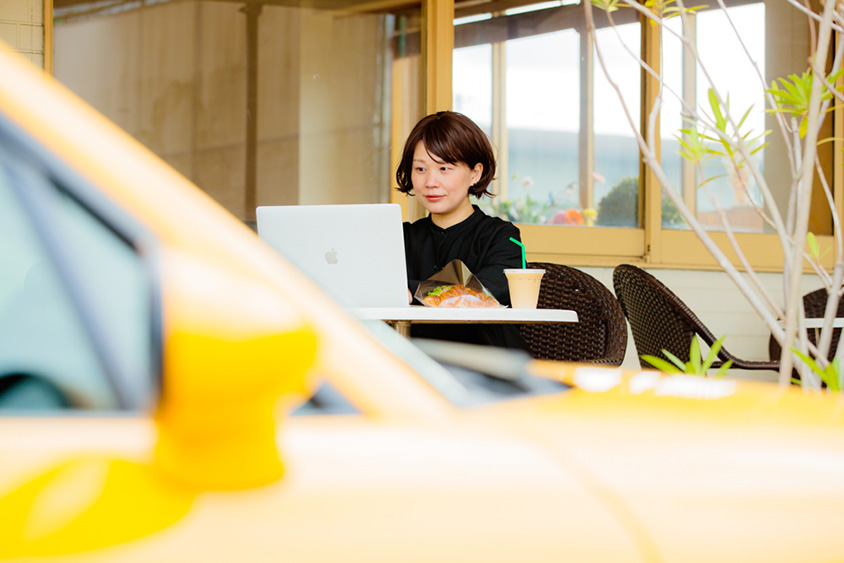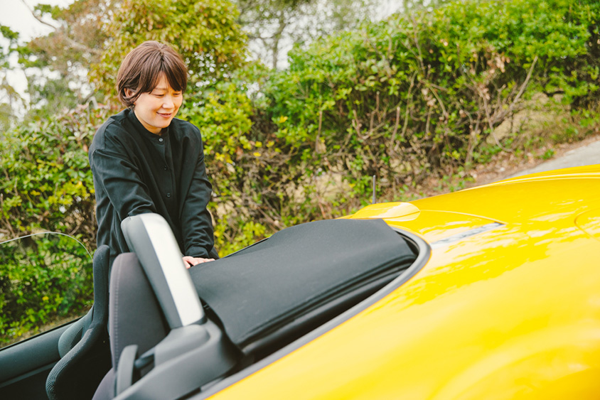 鮮やかな黄色のロードスターでさっそうと現れたフリーランスデザイナーの武藤絵美さん。シンプルなコーディネートのファッションに、鮮やかな黄色いロードスターの相性がとてもおしゃれ。そんな絵美さんの日常には、いつもロードスターが一緒でフットワークはとても軽い。たとえばふっと思い立ったときにパソコンと、クルマの鍵を手に取り、愛車のロードスターに乗り込み家をあとにする。前から気になっていたカフェへ行くときもあれば、偶然その日に見つけたカフェへ入ることもある。