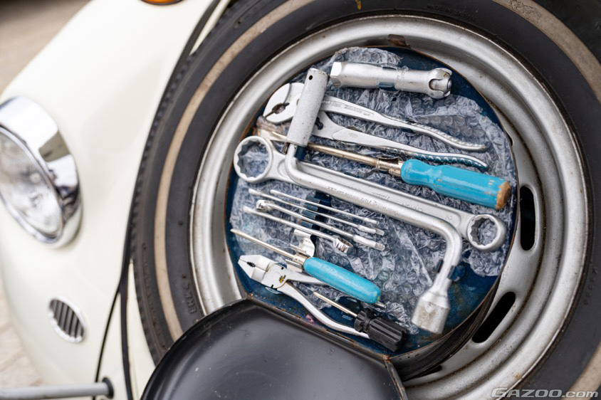 貴重な装備といえば、純正工具セットが残されているのも見どころ。スペアタイヤのスペースに収まるスチールケースや、中に収納される『ハゼット』の工具などは、中古車ではまず残されていることのないレアアイテムなのである。