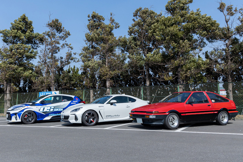 左からトラストのGRヤリス、GR86のデモカー、一番右は「赤パン」ことAE86(ハチロク)