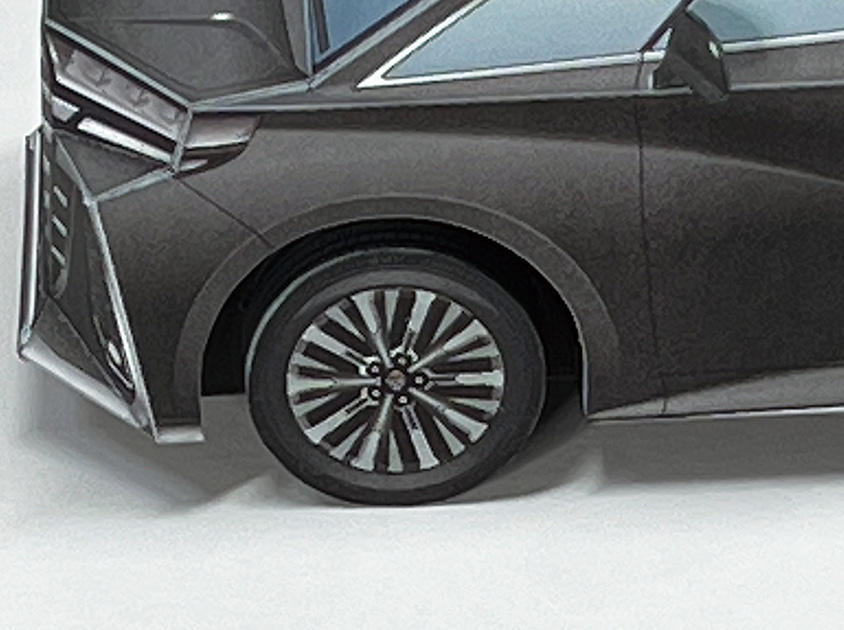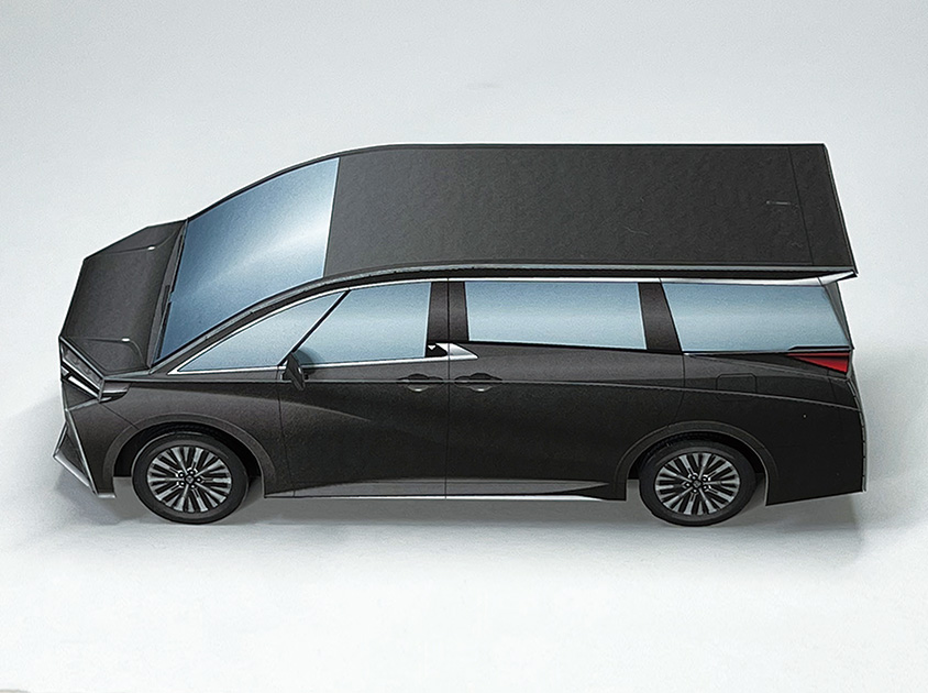 今回のペーパークラフトは、車体の流れるような起伏や大型グリルを、形状とイラストで最大限に表現しています。アルファードのボディカラーは“プレシャスレオブロンド”、ヴェルファイアは“ブラック”を採用。ホイールは、オリジナルデザインの19インチ大型ホイールとしました。ぜひ2台を並べて、フロントグリルやテールランプなどのデザインの違いもお楽しみください。