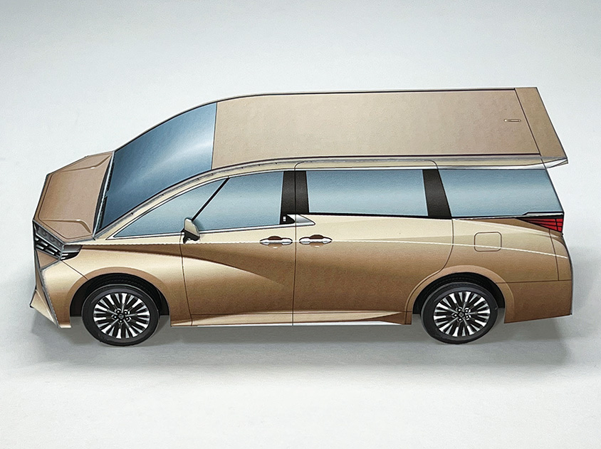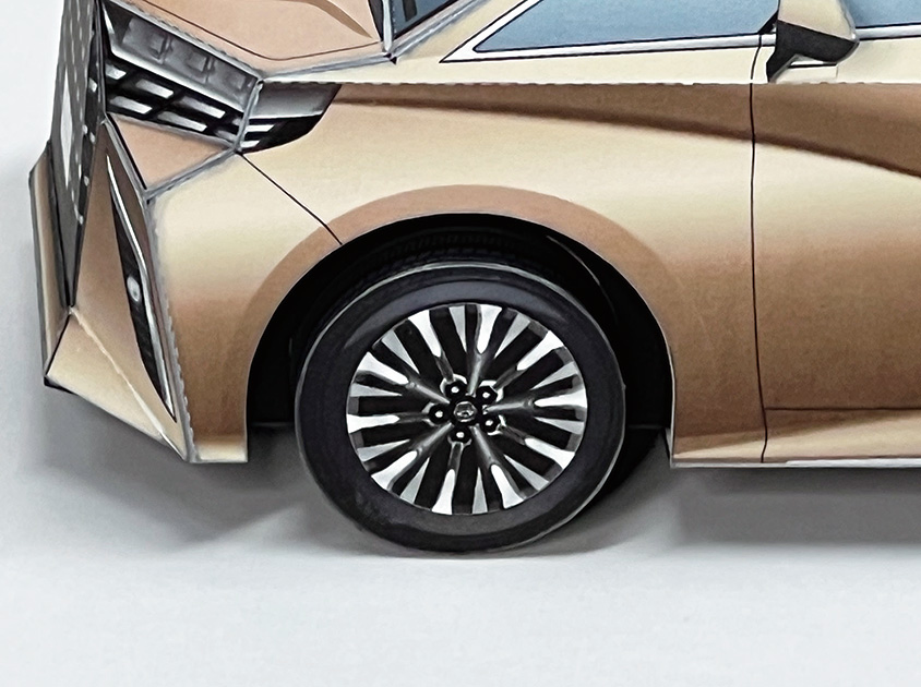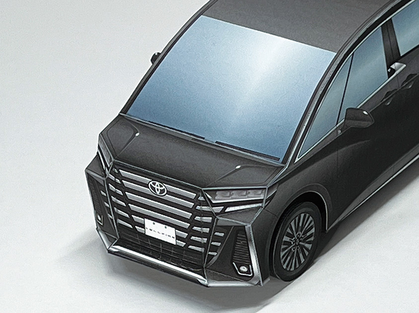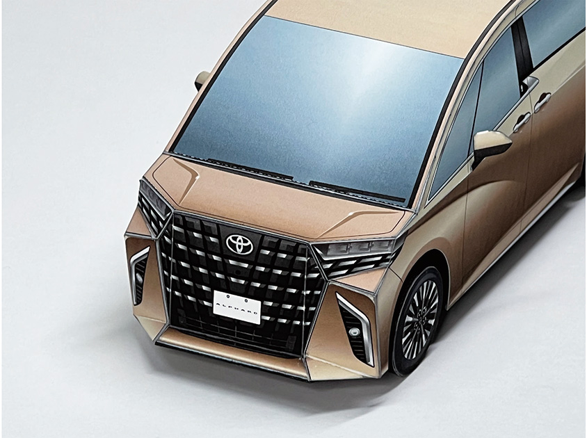 今回のペーパークラフトは、車体の流れるような起伏や大型グリルを、形状とイラストで最大限に表現しています。アルファードのボディカラーは“プレシャスレオブロンド”、ヴェルファイアは“ブラック”を採用。ホイールは、オリジナルデザインの19インチ大型ホイールとしました。ぜひ2台を並べて、フロントグリルやテールランプなどのデザインの違いもお楽しみください。