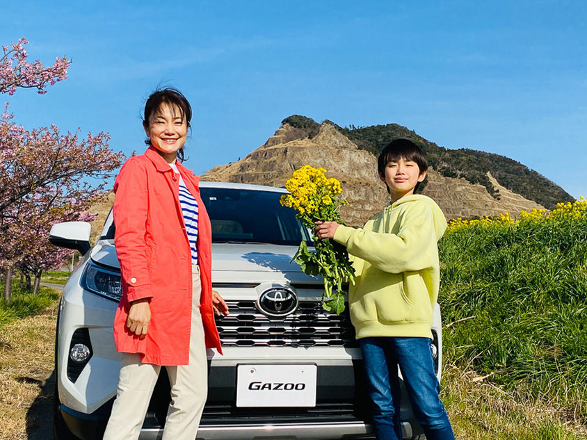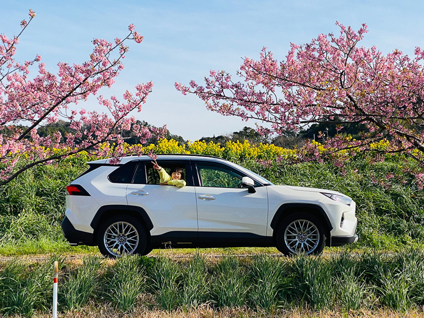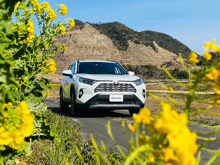 クルマはトヨタのSUV「RAV4 G」。菜の花畑と一緒に撮ると、ドライブの思い出になりそう