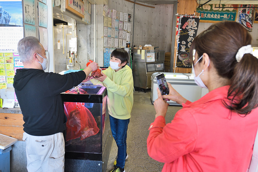 ここでは、野菜や果物、生け簀に入った地元の鮮魚も販売されています。魚屋さんに頼んで、購入した地ダコを触る体験をさせてもらいました。
