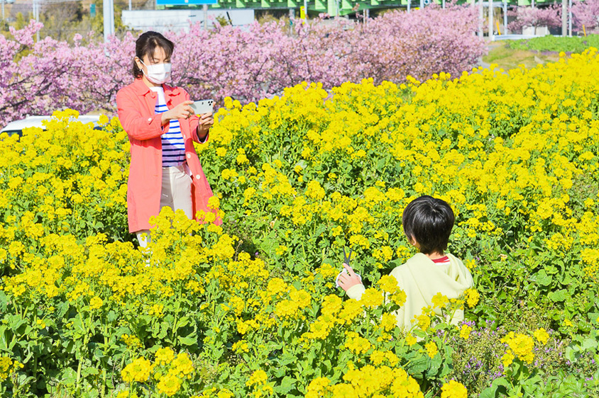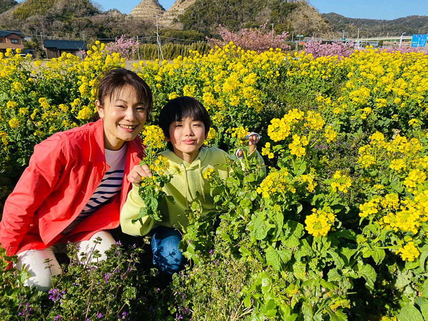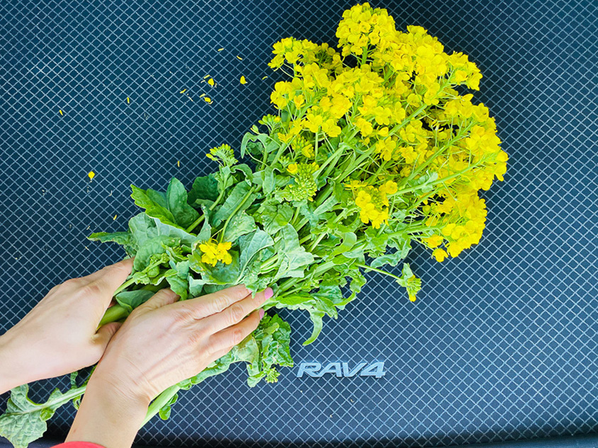 高速道路を降りて、館山方面へのドライブ中の道沿いに菜の花摘みができる畑を見つけました。ちょうど菜の花は満開のようです!都心よりも南にあって、早めの春が感じられる館山ならでは。周辺には早咲きの桜も咲いていて、とてもきれいです。