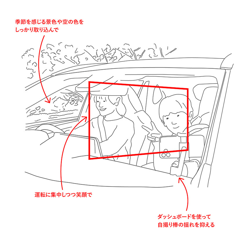 - 走行中でなくてもよいので、車内でのセルフィにチャレンジしてみてください。