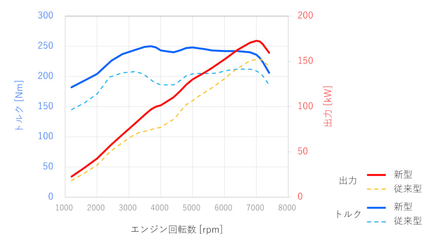 - レスポンスの向上、高回転域まで伸びるフィーリングを実現し、0-100km/h加速性能は従来型の7.4秒から6.3秒に短縮