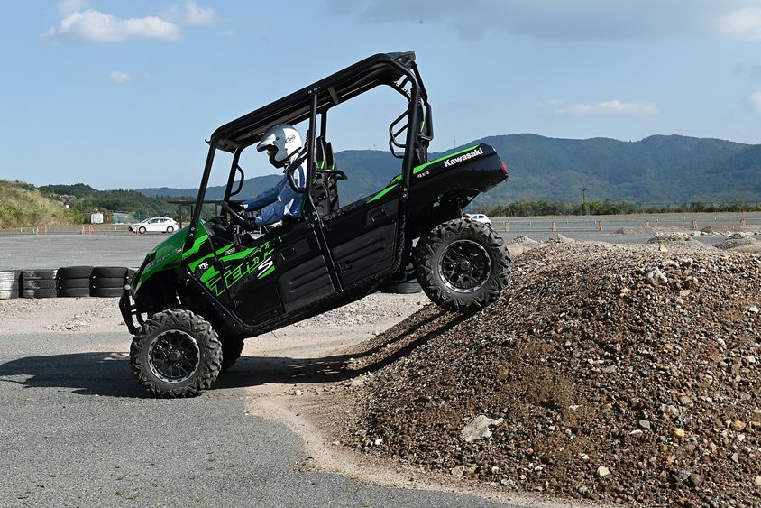 このバラエティーに富んだコースを体験するために、カワサキモータース製の「TERYX4 S LE」「MULE PRO-FXT EPS」という2台のバギーが準備されている。TERYX4 S LEは、4人乗りで、軽量なダブルXフレームを採用しスポーティなバギーだ。MULE PRO-FXT EPの、MULE シリーズは30年にわたり全世界で愛用されてきたバギーだ。PRO-FXT EP は6人乗りで、荷台を備えている。2台とも2ペダルなのでAT限定免許の人でも容易に運転できる。