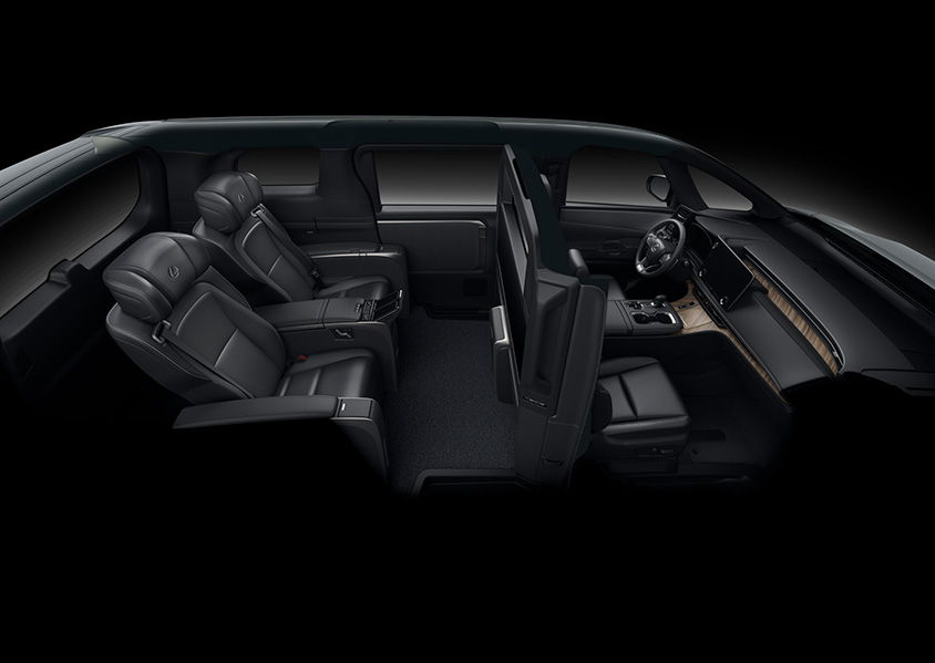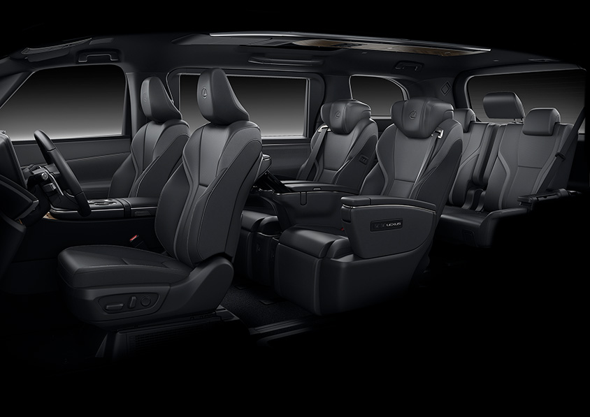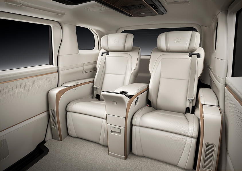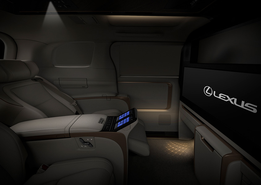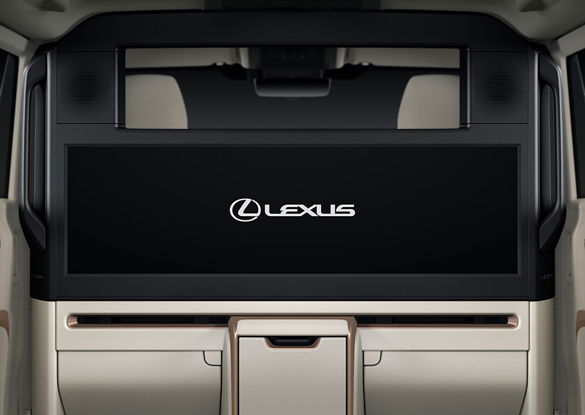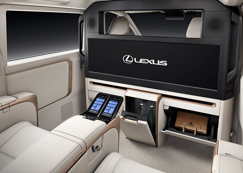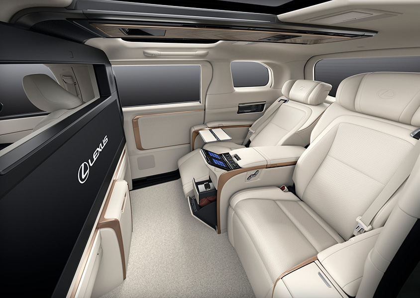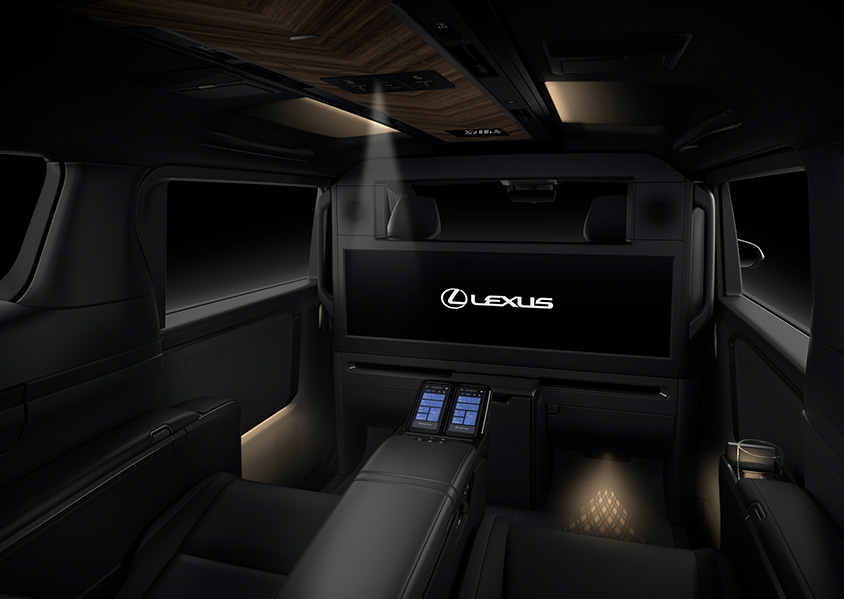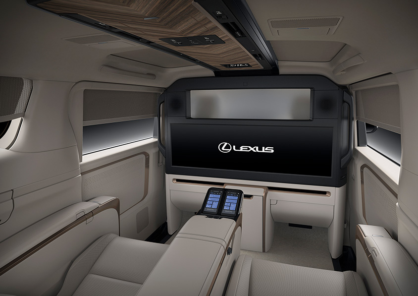インテリアは、シームレスなデザインで表現されており、リビングのようにくつろげる世界観となっているという。4座仕様(4席仕様)には、リヤ席前に48インチ大型ワイドディスプレイを備えたパーテーションが配置される。更に前席との間には昇降ガラスが取り付けられる。スピーカー、冷蔵庫なども含め内装部品間の段差は極限まで低減される。またリヤシートは大型独立シートが設置され、そのシートにはレクサス初のアームレストとオットマンにシートヒーターが設置される。また乗員と周辺温度を検知する「温熱感IRマトリクスセンサー」を設置し、顔、胸、大腿、下腿の4か所の温度を推定して、エアコン、シートヒーターなどを一括し適温に保つ。