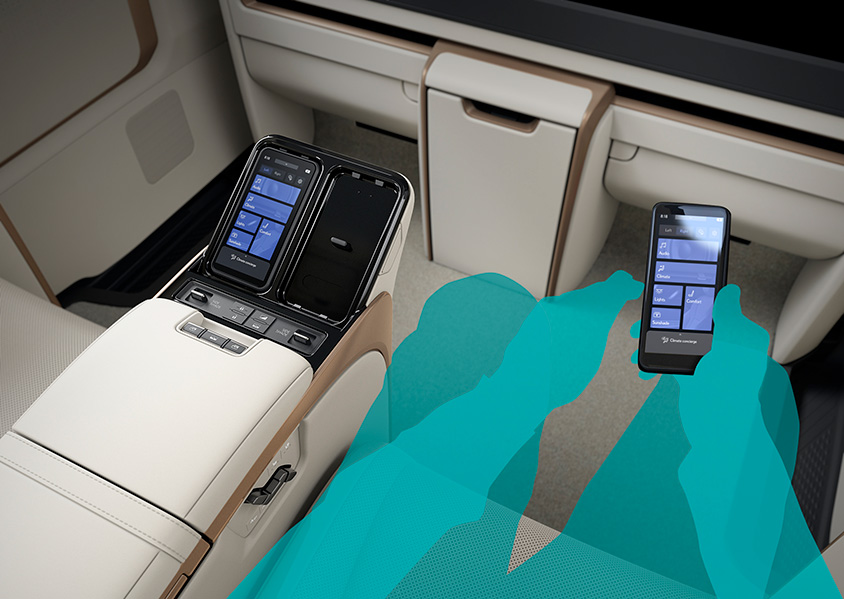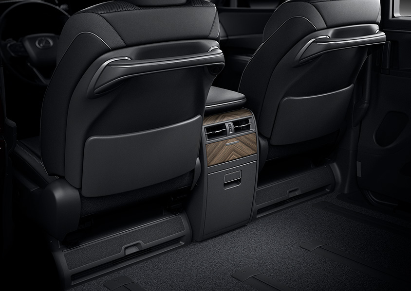 また車内は、リビングのようにくつろげるだけでなく、ビジネスシーンにも対応できる空間になっている。例えば、間接照明の採用、イルミネーションは14色のテーマカラーとお好みに合わせて選べる50色のカスタムカラーで計64色が準備されている。後席の各種機能を操作するリヤのリヤマルチオペレーションパネルは脱着可能なタッチ式コントローラで、左右の乗員用に2個準備されている。エアコン/シートポジション/サンシェード/照明などを統合制御可能なレクサス初採用の「リヤクライメートコンシェルジュ」が搭載される。