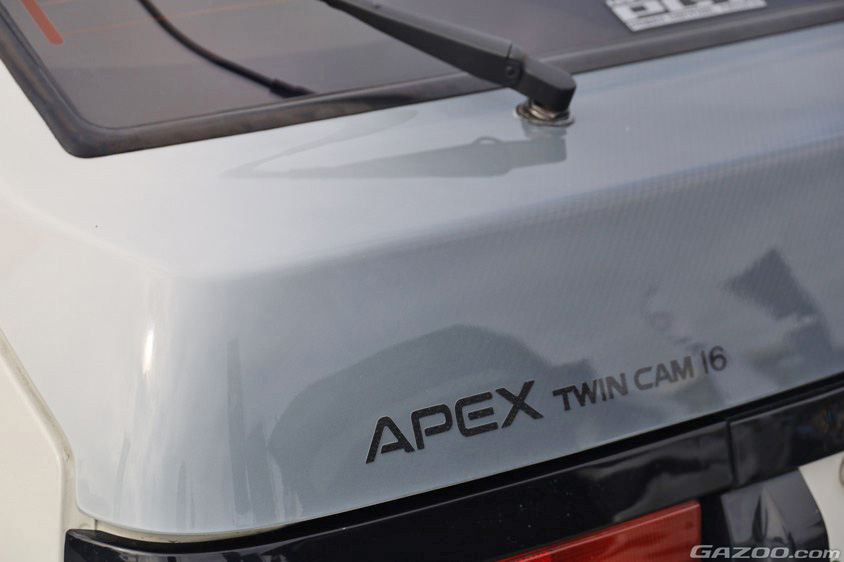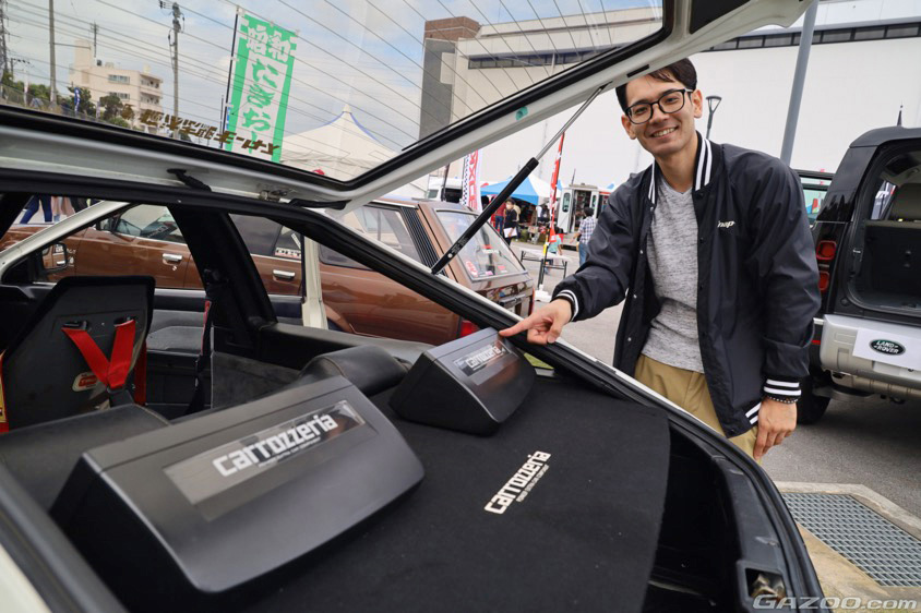 カーボン製ハッチバックはグラデーション塗装で仕上げ、14インチのセリカXX純正ホイールを装着。室内もカロッツェリア製スピーカー(スピーカーボードも!)をはじめ、当時の雰囲気にこだわったパーツチョイスで、通りがかる来場客を釘付けにしていた。