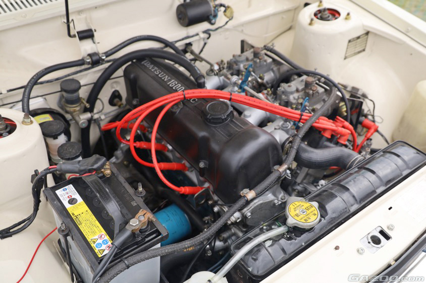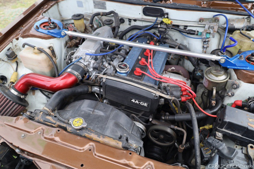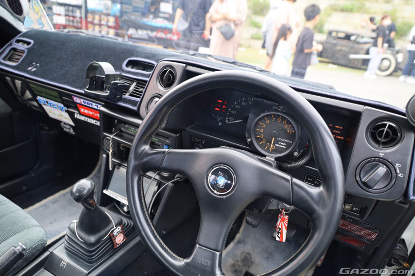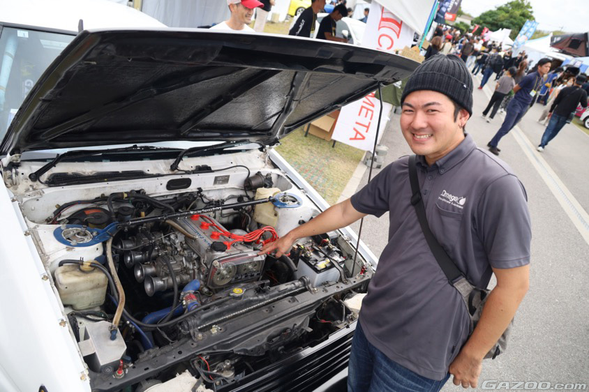 いっぽう、2ドアのカローラレビンは、オートサービスP.C.Tの吉田朝洋さんがサーキットで走らせているというドリフト車両。「自分で組んだキャブ仕様のエンジンがお気に入りです」と満面の笑顔で教えてくれた。撮影のためにエンジンルームを開けるとさらに注目度は高まり「ショップの知名度アップにもなるのでうれしいですね!」と展示を楽しんでいるようだった。