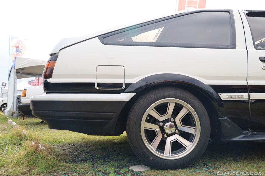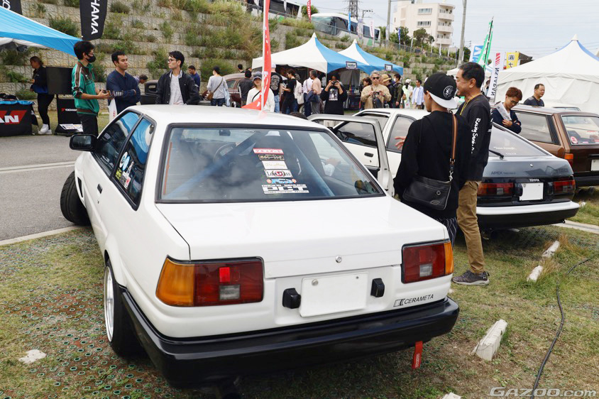 会場となった沖縄アリーナの外周に設けられた『アウトドアエリア』のウエルカムゲート付近で、たくさんの来場者から注目を集めていたのが白黒ツートンのスプリンタートレノ&カローラレビン(AE86)。お話を伺ってみると、オーナーさんはどちらも20代とのこと!