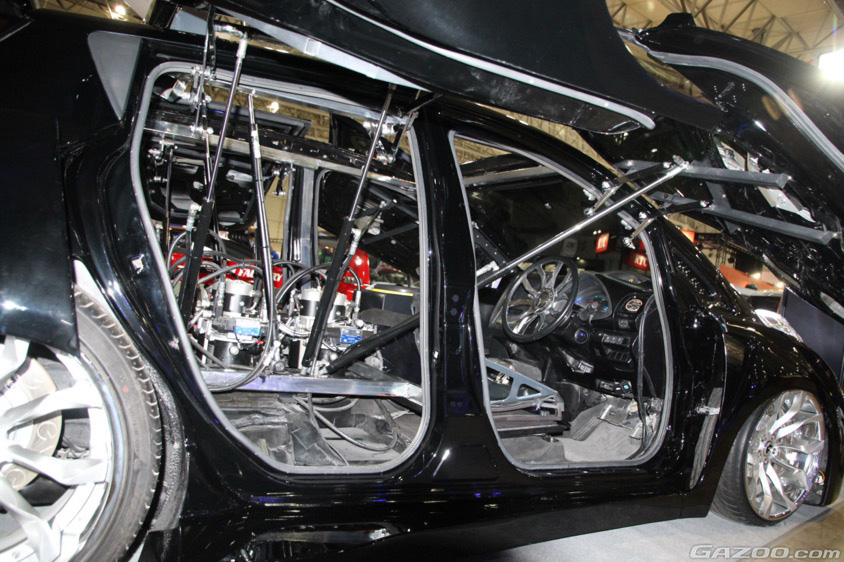 4枚のドアとハッチ、さらにはルーフと車高までそれそれがハイドロ(油圧)で開閉するようにシステムが組まれ、オープンしたルーフにはスピーカーとモニターが埋め込まれている。