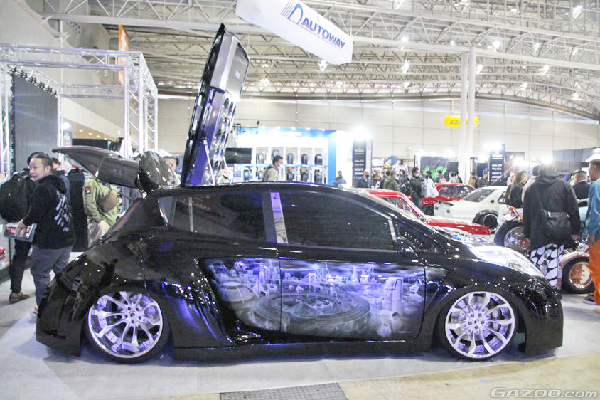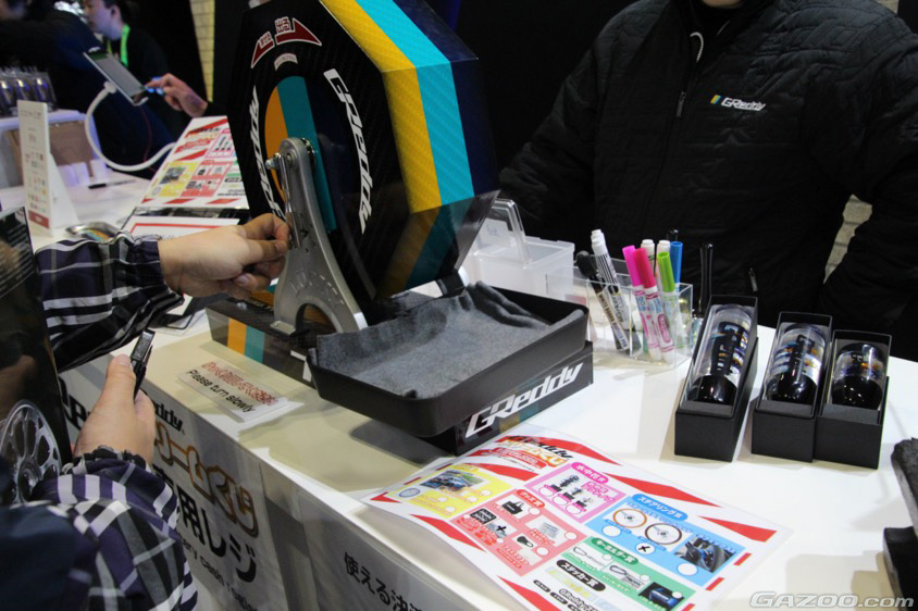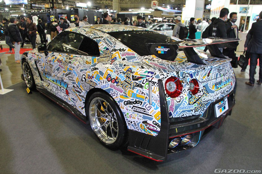 チューニングパーツメーカーの『トラスト』ブースは、たくさんの『GReddy』ロゴでドレスアップされたR35を先頭にドドーンと展示していた。「みなさんにウチのロゴを使って自由にデザインしてもらい、そのデザインでラッピングした車両をオートサロンに飾るという『みんなのGReddyプロジェクト(みんGR)』でできあがったクルマです」とのこと。