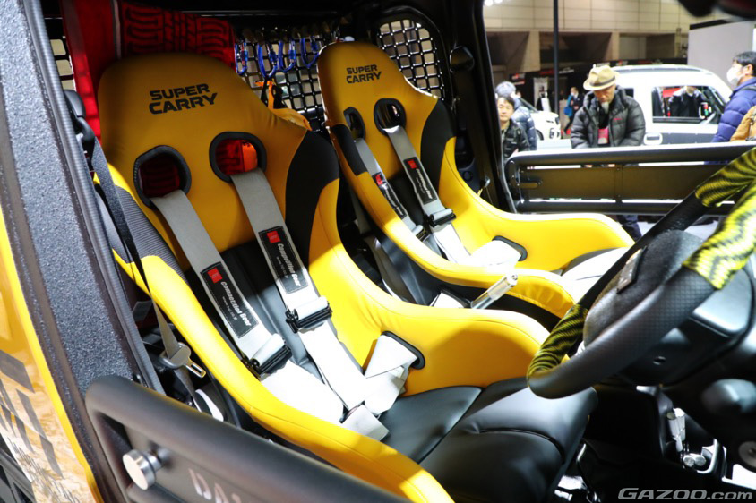 カスタマイズの主な内容は、外装にイエローとブラックの専用カラーを採用し、アクティブな雰囲気を演出。車体や荷台に装備したロールケージなどが、ワイルドな外観を醸し出す。足まわりでは、ホイールを12インチから14インチに大径化し、悪路走行にも対応するブロックパターンのオールテレーンタイヤも装着。室内にはバケットタイプのシート、センターモニター代わりのタブレットにも防水タイプを使うなど、各部を徹底的にアウトドアスペックに対応させている。オフロードなど、外遊び向きのスズキ車と言えばジムニーの印象が強いが、同様のテイストを軽トラックに採り入れたのは斬新。軽トラック系カスタマイズの新基軸となりそうだ。