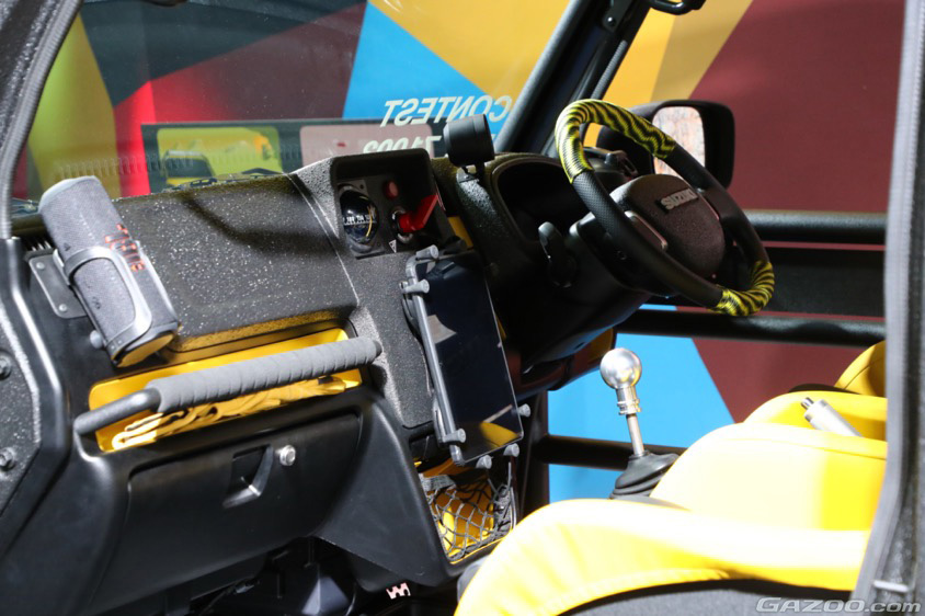 ダッシュボードなどには、傷に強く、ザラザラした表面となるチッピング塗装を施す(左)。バケットタイプのシートも、外装に合わせイエローカラーでコーティネイト(右)。