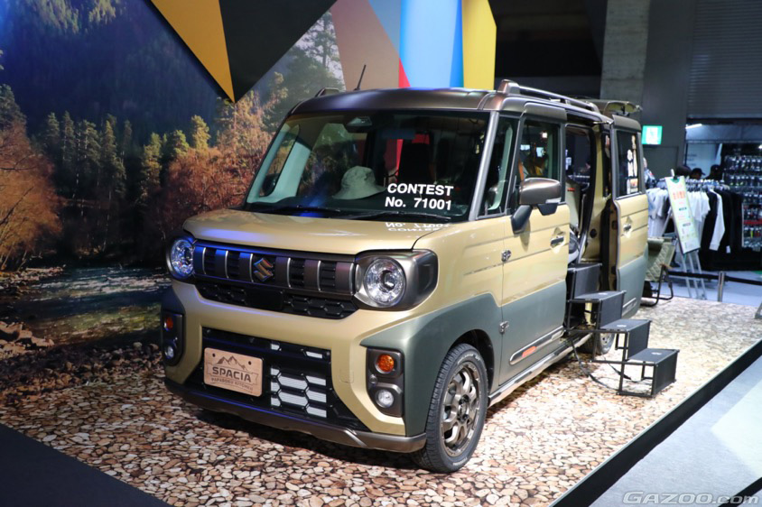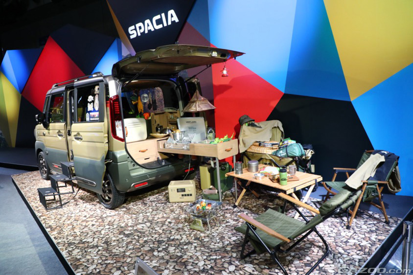 外装をアースカラーとすることで、アウトドアとの親和性を高める。『スペーシア パパボクキッチン』は参考出品だが、是非とも市販化されてほしい。