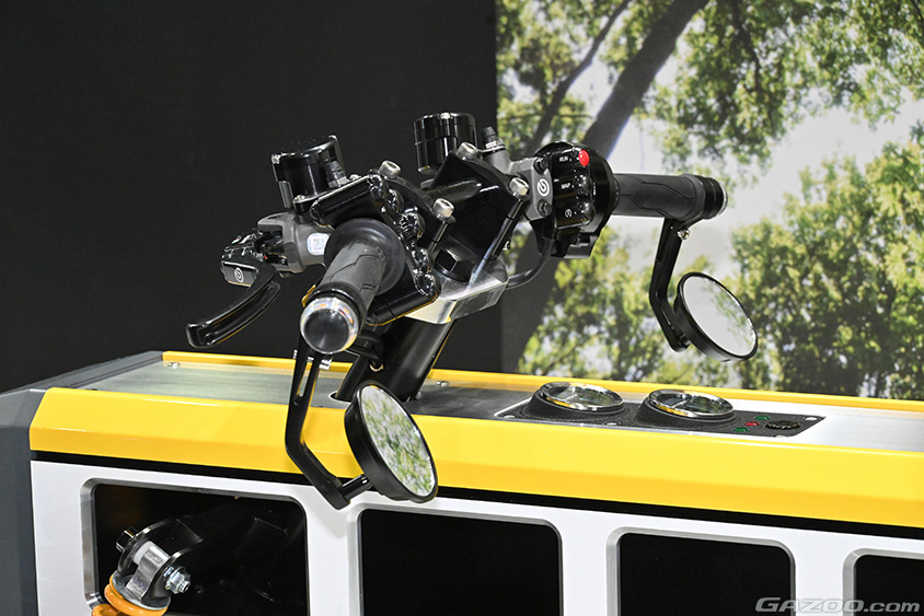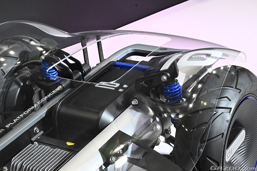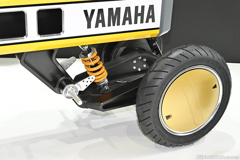 小型EV汎用プラットフォームは「YAMAHA MOTOR PLATFORM CONCEPT」と呼ばれる、1~2人乗りの低速パーソナルモビリティでの活用を想定した研究開発中のEVプラットフォームだ。バッテリーにはホンダのHonda Mobile Power Pack e:を搭載している。パワーユニットは、バッテリー、ホイールインモーター、コントロールユニットとなる。このパワーユニットは同一のものを使い、車体を変えることで色々な使いかたができるというのがコンセプトなのだ。車体、それが仮に一部であっても共通化すると制約が大きくなるのは筆者でも容易に想定できる。
