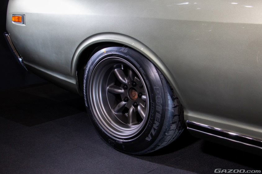 現行GT-Rの純正色であるジェイドグリーンに塗装されたボディに組み合わせるホイールは、旧車のド定番となるRSワタナベ。サスペンションやブレーキはオリジナルパーツで現代風に強化している。またフェンダーはノーマル風を装うが、ボディラインを保ちつつ、微妙にワイドな形状でワンオフしている。