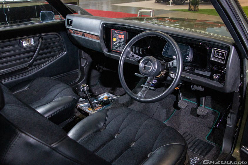インテリアも、基本的に元の状態を再生。ステアリングは日産旧車の定番であるダットサンコンペに変更。その奥のメーターパネルはリンク製の多機能デジタルメーターやCARTEKのワイヤレスコントロールシステムを組み合わせて大変更されている。