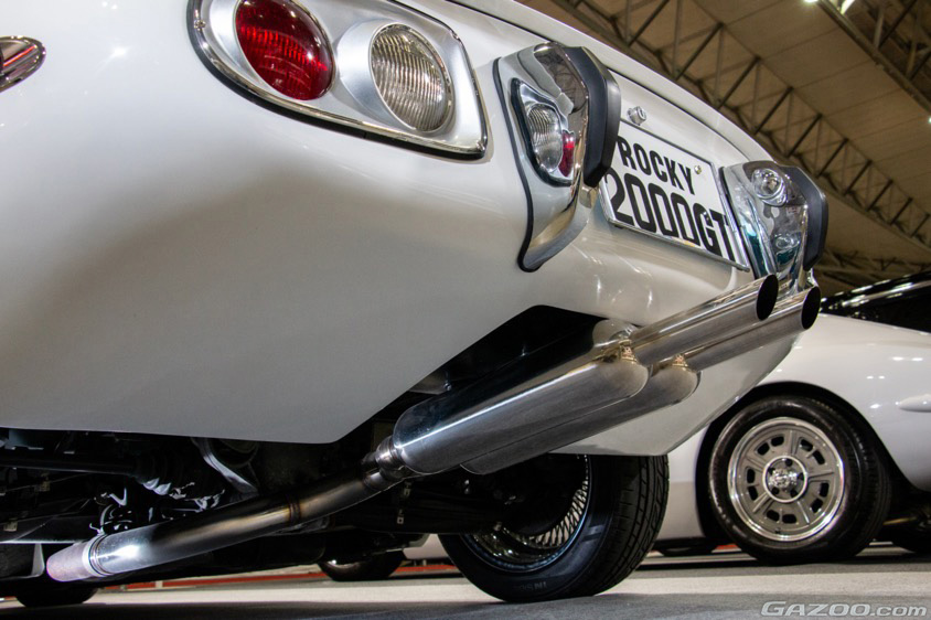 テール中央に2本出しとなるマフラーもトヨタ2000GT同様のキャプトンタイプ。テールランプやバンパーは、ROCKY3000GT製作時にトヨタ2000GTの純正品同様の形状で製作されたものなので、ROCKY2000GTにも継続使用されている。
