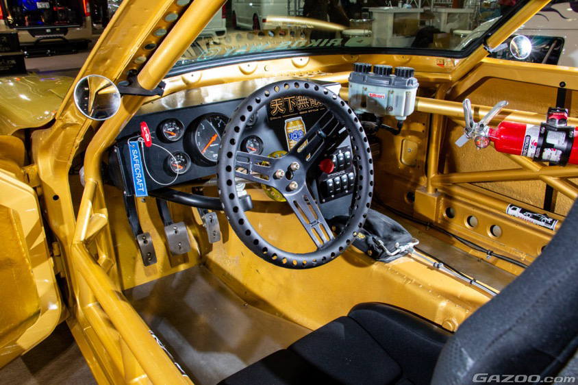 インテリアもレーシングカーそのもの。ワンオフ製作されたインパネや、張り巡らされたロールバー、レーシングパーツそのものとなるTILTON製ペダルなどを組み込み、さらにRIKOさん流のアレンジを加えたド派手なコクピットを作り上げている。