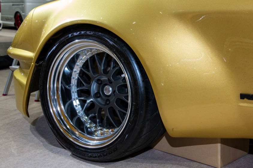 1970年代のIMSAのレーシングカーをイメージしたというだけに、前後フェンダーには巨大なオーバーフェンダーが装着される。また日本が大好きなRIKOさんだけに、ホイールはワーク、タイヤはトーヨー、サスキットはテインと日本ブランドのパーツを組み合わせている。