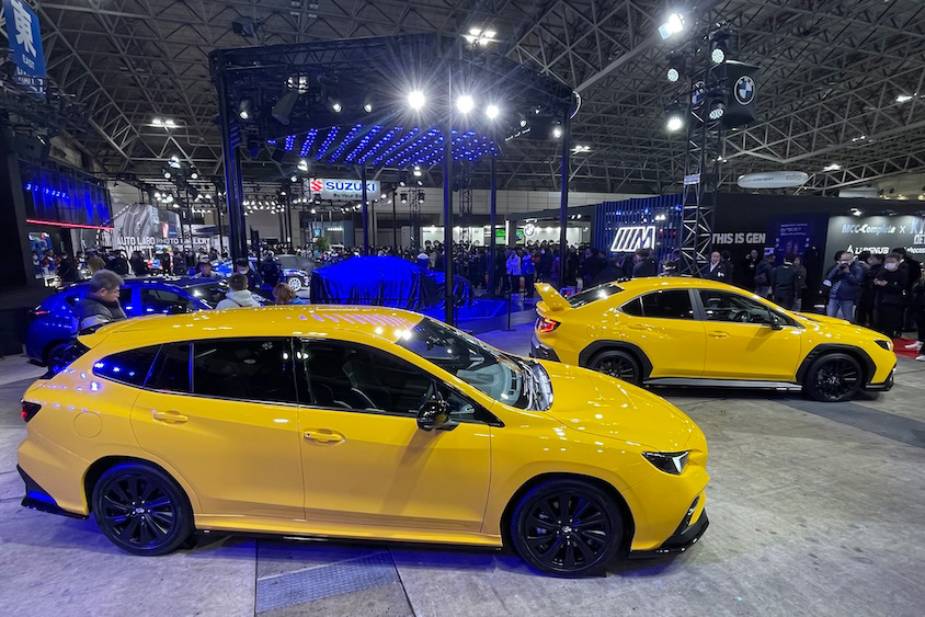 もちろん市販車も見所多数。レヴォーグ STI Sport R-Black Limited II STI Performance(手前)および、WRX S4 STI Sport R-Black Limited II STI Performance(奥右)は特別塗色のサンライズイエローをまとい、会場多くの人をひきつけていた。奥左はインプレッサ ST-H STI Performance Edition PLUSパッケージ装着車。