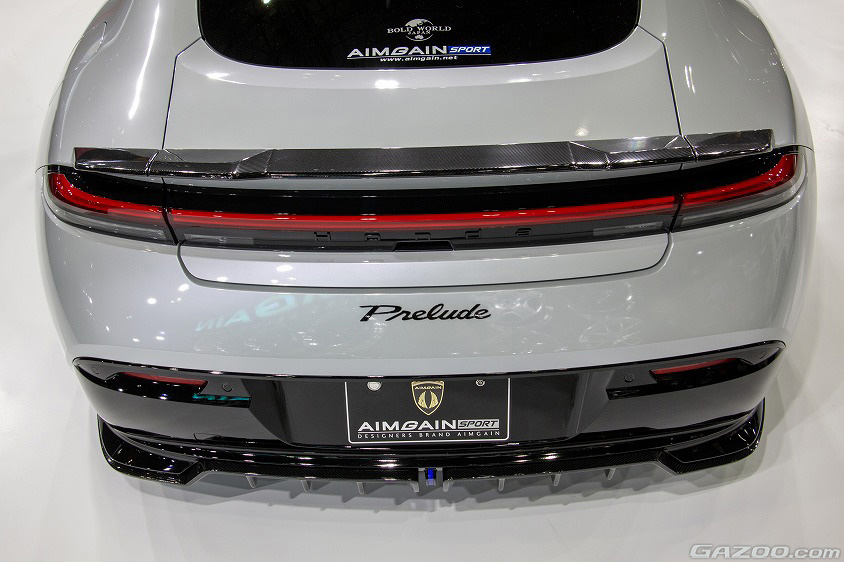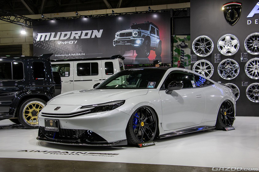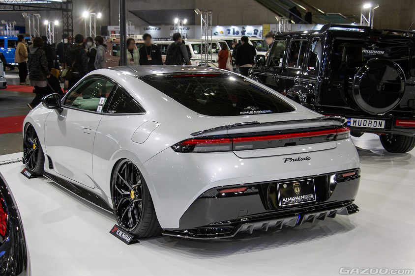 AIMGAINは、自社のエアロパーツを身に纏った新型プレリュードを出展。フロントアンダースポイラー、サイドスポイラー、リヤディフューザー、リヤスポイラーから成る構成。どれもプレリュード本来の空力性能を阻害しないよう小ぶりなサイズとしてるが、しっかりとAIMGAINらしい存在感を高めるデザインとなっている。