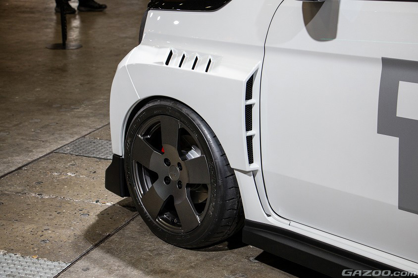 ワンオフ鍛造アルミホイールを覆うオーバーフェンダーは、後方にエアアウトレットが彫られたレーシーな造形。あくまでもプロタイプなので市販化などは未定だが、是非ともこのままの形で販売してほしい。