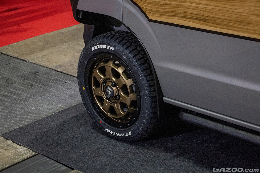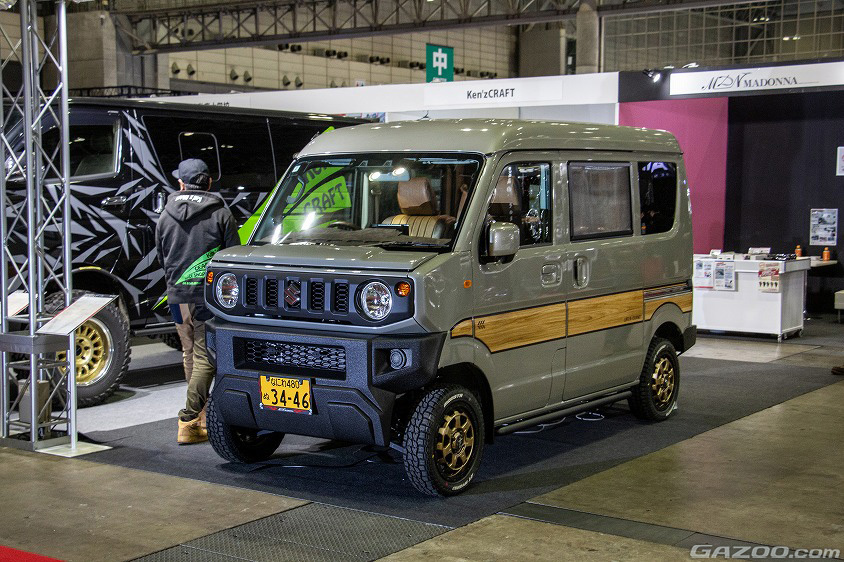 DA17エブリイに、ジムニーの純正マスクを嵌めるボディキットを組み込んだ車中泊仕様がジブリィプレシャス。エクステリアはジムニーマスクを入れるためにフロントフード、左右フェンダー、そしてバンパーが専用品となる。ちなみにリヤもフロントに合わせたオリジナルのバンパーで、共にラプター塗装仕上げ。