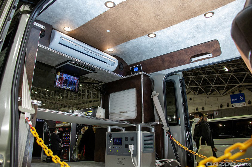 また、車中泊仕様ということで、車内には吊り下げ式の12Vクーラーを装備しているところも見逃せない。このクーラーは、2000Wのポータブル電源で可動するもので、充電無しでも5時間程の使用が可能という。