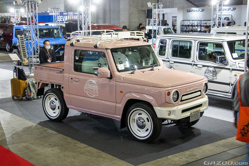 その可愛らしいビジュアルからなのか、多くの女性が足を止め、写真を撮っていたのが、Heritage Jimny Truckだ。ピックアップスタイルを現行ジムニーで実現させた車両となる。そのカスタマイズの手順は、リヤクォーターウインドウの前端ぐらいでカットして、後ろにキャリイの荷台を付けた、と文字にすると簡単そうだが、実際はかなり面倒な作業らしい。