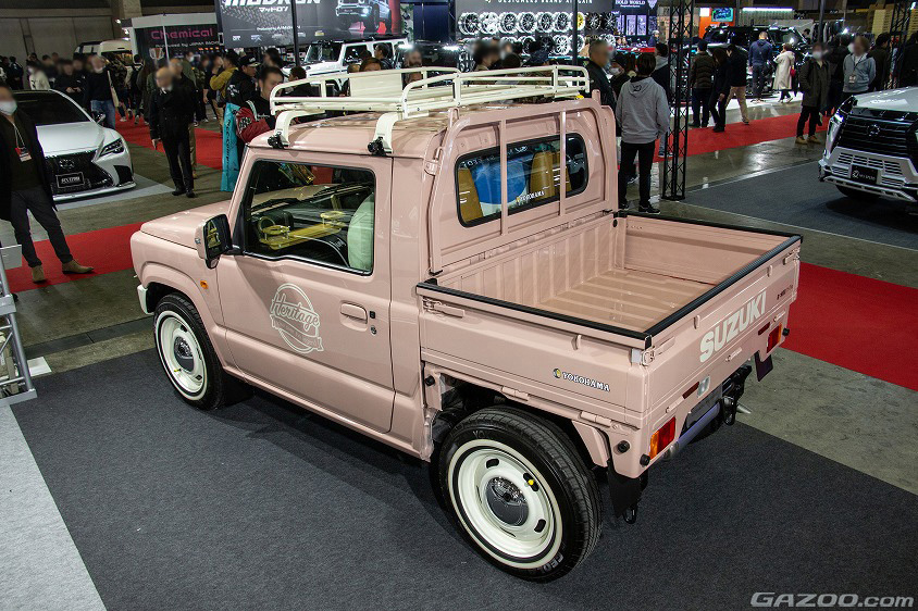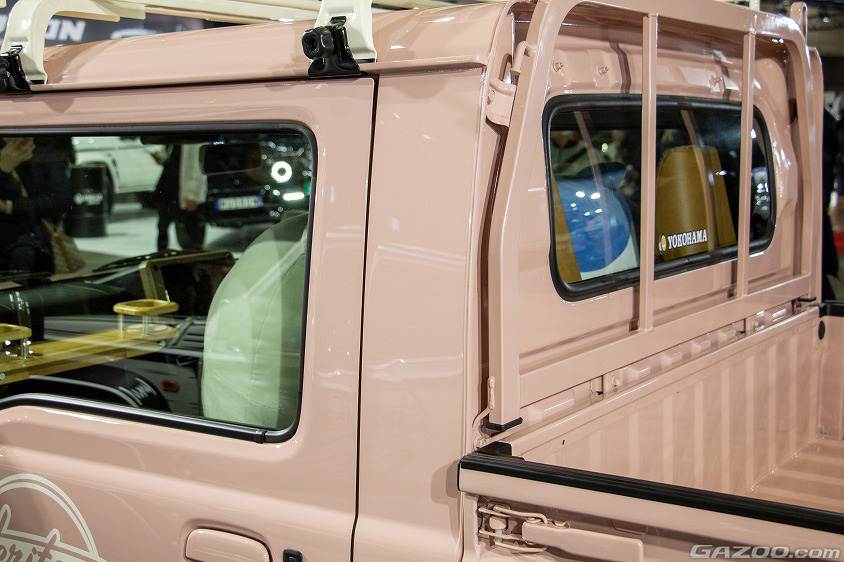 ちなみにボディ色は、オシャレピンクと名付けられたピンク。アイボリーなどジムニー定番色にしてしまうとトラックのインパクトが薄れそうなので、この色を選んだそうだ。