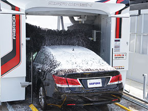 1台あたり約3分で完了! ベルトコンベヤで進むドライブスルーの洗車機